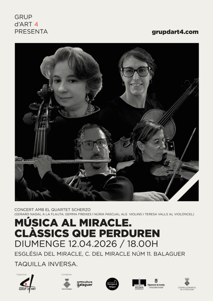 L’Associació Cultural Grup d’Art’4 organitza la tercera audició del cicle de Concerts al Miracle amb el patrocini del Consell Comarcal de la Noguera , les col·laboracions de la Paeria de Balaguer i la Parròquia de Balaguer. Aquest concert es farà el proper 12 d’abril a les sis de la tarda, a l’església del Miracle de Balaguer.
